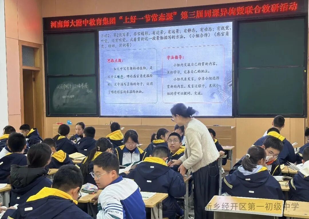 为深入贯彻落实新乡市教育局关于 “同课异构”联合教研活动会议精神,积极响应河南师范大学附属中学教育集团以“上好一节常态课”深化“共建共享、协同发展”的教研导向,作为河南师大附中教育集团领办的成员校,积极参加了河南师大附中教育集团第三届同课异构暨联合教研活动,10月21日下午,我校采取随机抽签方式选定七年级语文教师雷苹,围绕《从百草园到三味书屋》这一课与新乡市平原中学马兰兰老师、河南师大附中张帅老师进行了“同课异构”教学展示。我校校长刘敏灵、副校长李璐及全体语文教师全程参与观摩研讨。