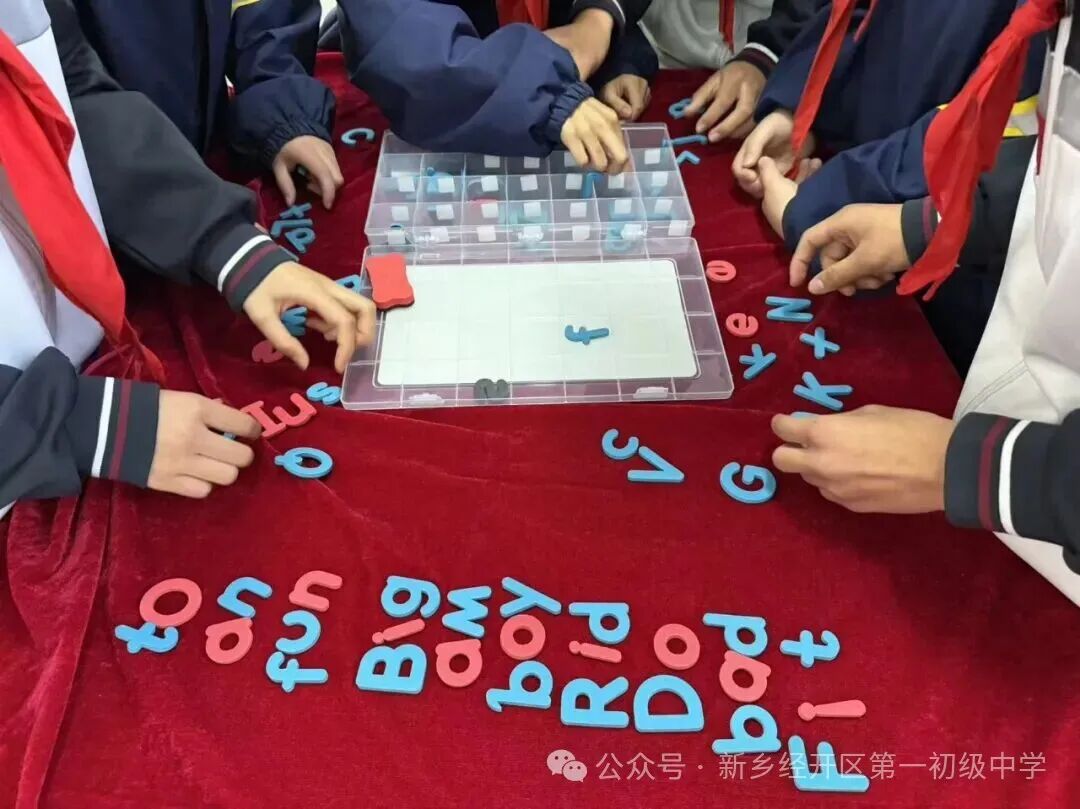 紧接着的“拼词大战”将比赛气氛推向高潮。晋级的队伍要在五分钟内,用有限的26个字母磁贴,拼出尽可能多且不重复的单词。字母磁贴在队员们手中迅速传递、组合,桌面上单词飞快地成型又被拆解重组,队员们分工协作,紧张有序,充分展现了同学们灵活运用知识的能力和出色的团队合作精神。