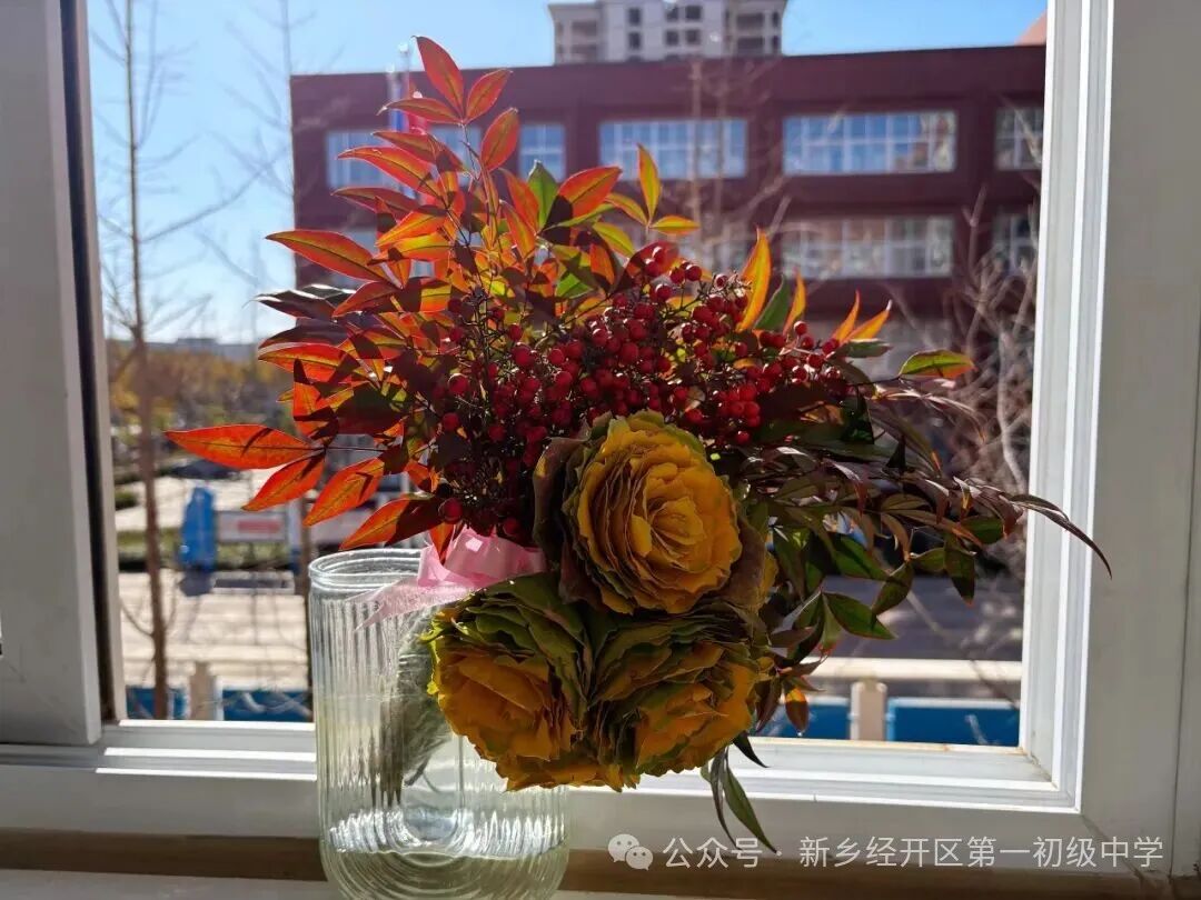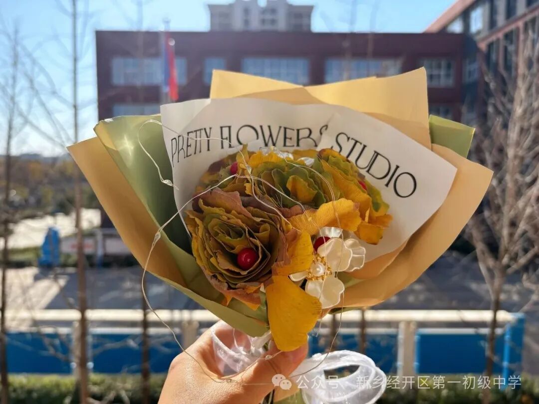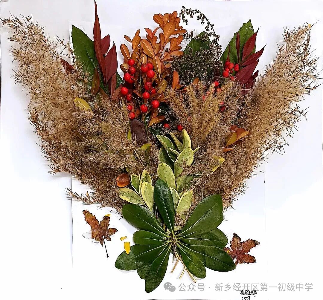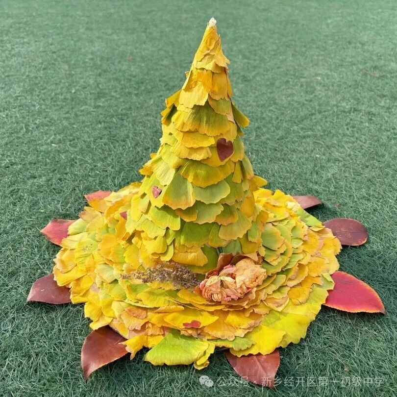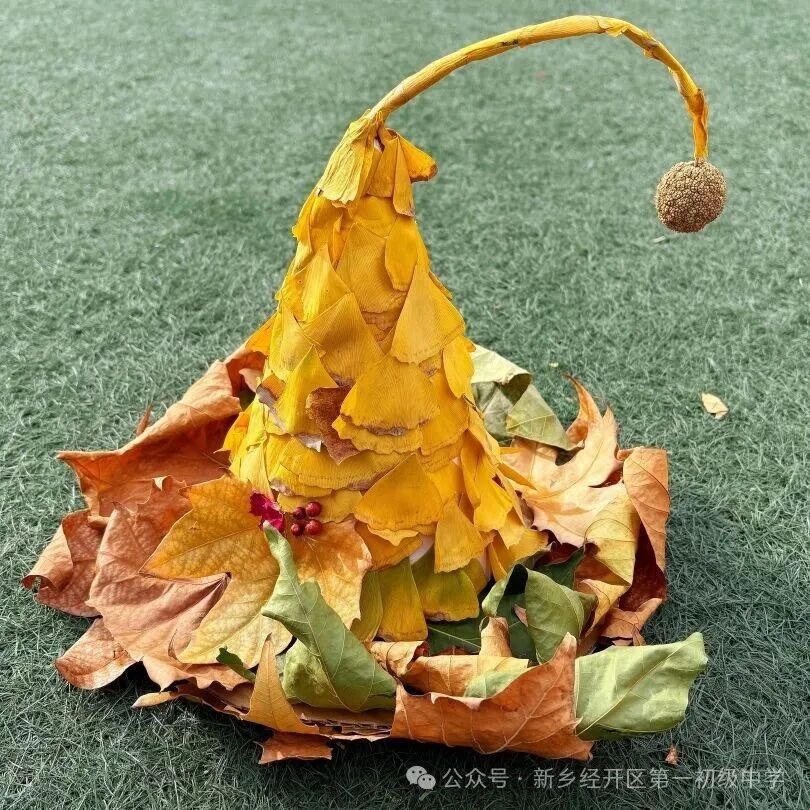 有的同学将叶片组合成花束,搭配其他落叶,创作出富有层次感的艺术作品;有的同学们将一片片金黄的银杏叶卷成玫瑰花瓣,层层叠叠,栩栩如生。