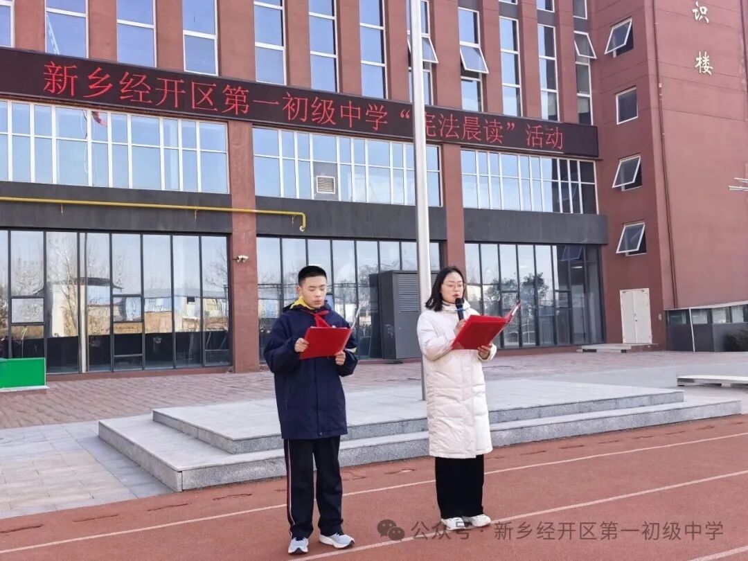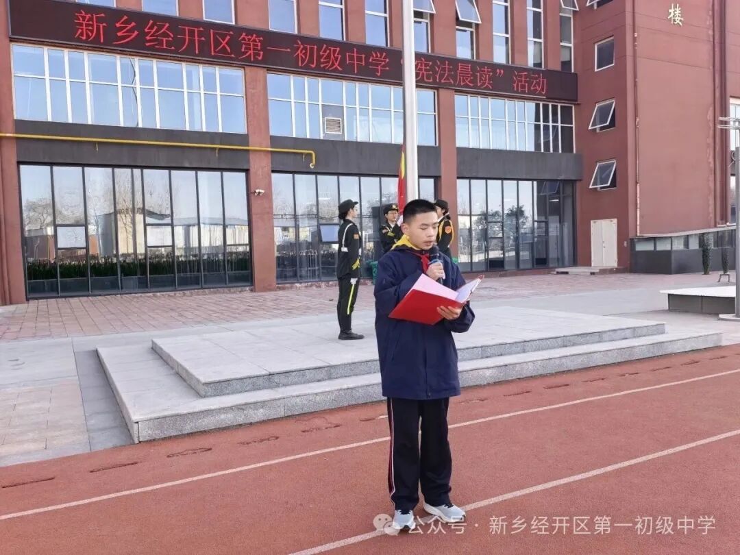 12月4日上午,全校师生齐聚操场,在学生指导中心主任米若萱的领读下,齐声诵读宪法部分条款。副校长李永超聚焦青少年日常,结合校园常见场景,为全体师生解读了新修订的《治安管理处罚法》中与未成年人密切相关的内容。随后,新乡市公安局红旗分局纬七路派出所四级警长赵继红作总结讲话。赵警官肯定了晨读活动意义,并从“知法、懂法、守法、用法” 四个维度对学生提出殷切期望。