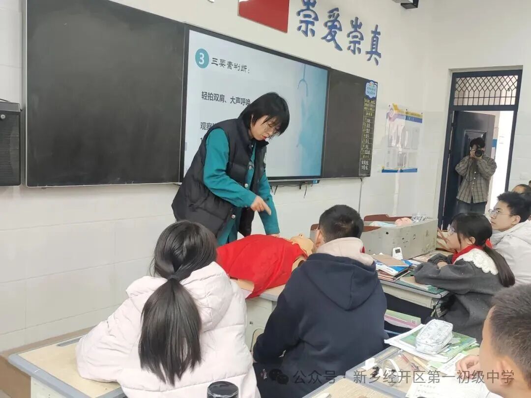 急诊医学科副主任李风芹现场开展心肺复苏、海姆立克急救法培训,同学们通过理论学习与实操演练,掌握基本急救技能,提升自救互救能力,筑牢校园安全防线。