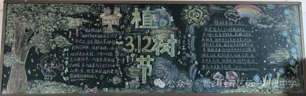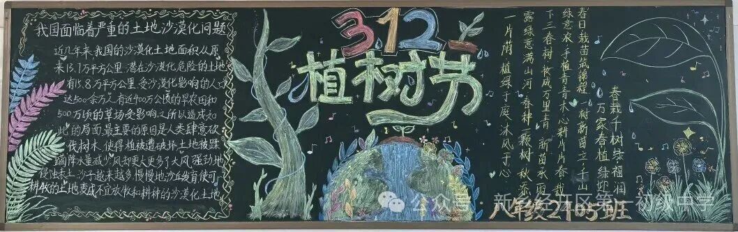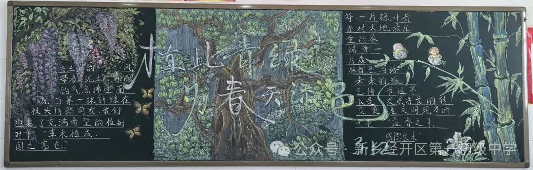 二、方寸黑板,绿意生花 教室,是同学们学习生活的主阵地,也是班级文化建设的重要载体。在植树节来临之际,八年级各班围绕“植树节”主题,精心创作了一幅幅内容丰富、色彩斑斓的黑板报。