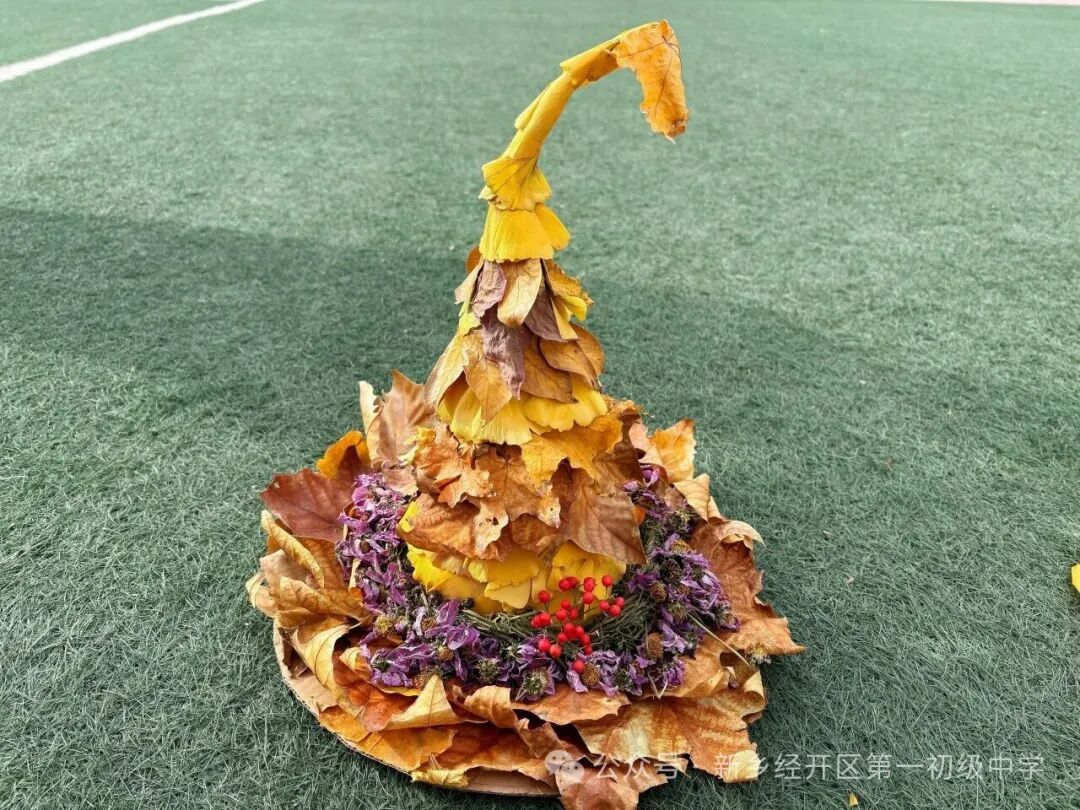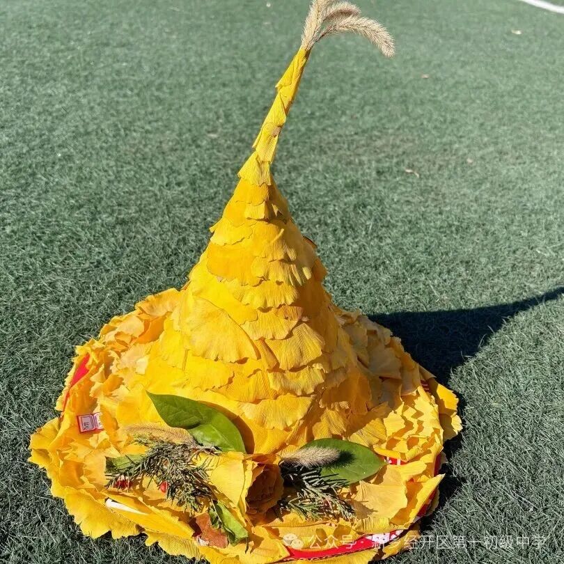 同学们用捡来的银杏、红枫、梧桐等各式落叶,充分发挥天马行空的想象力,精心创作属于自己的独特帽饰。