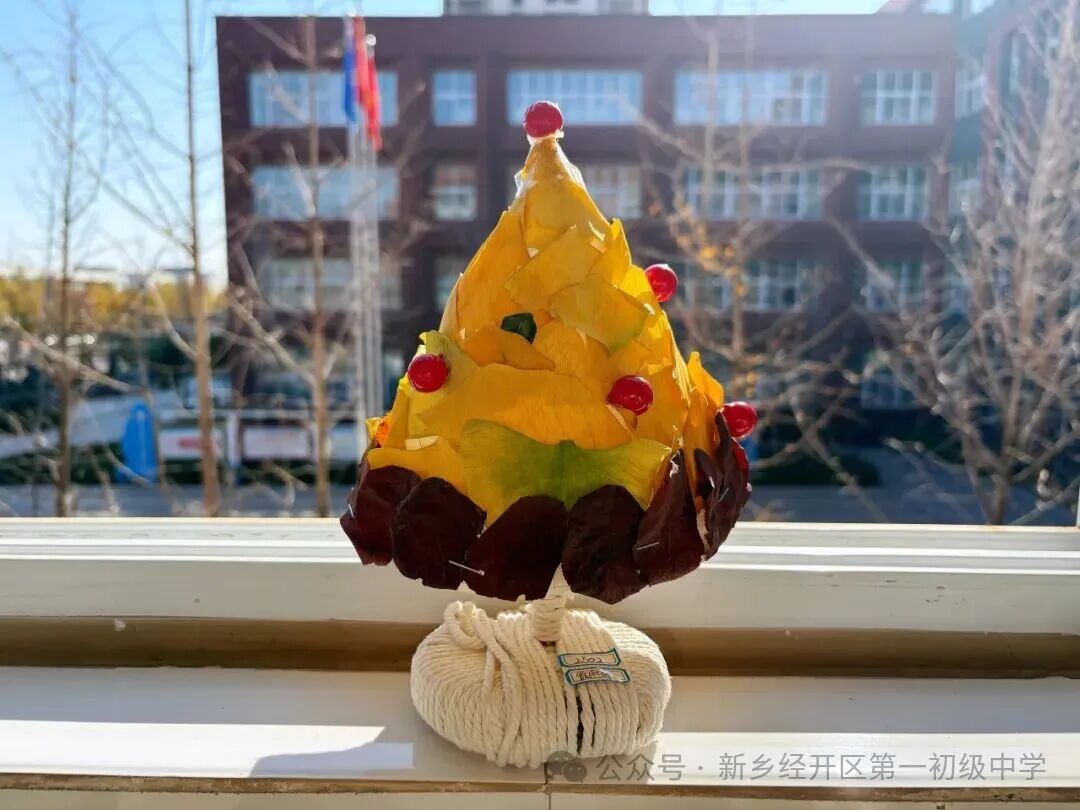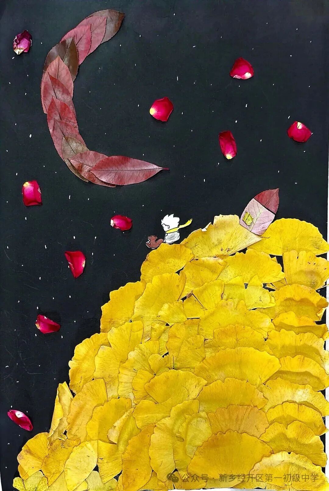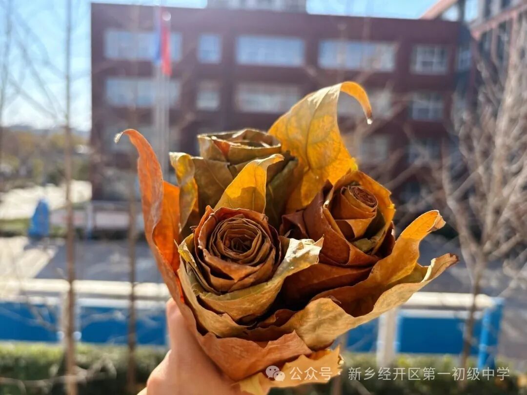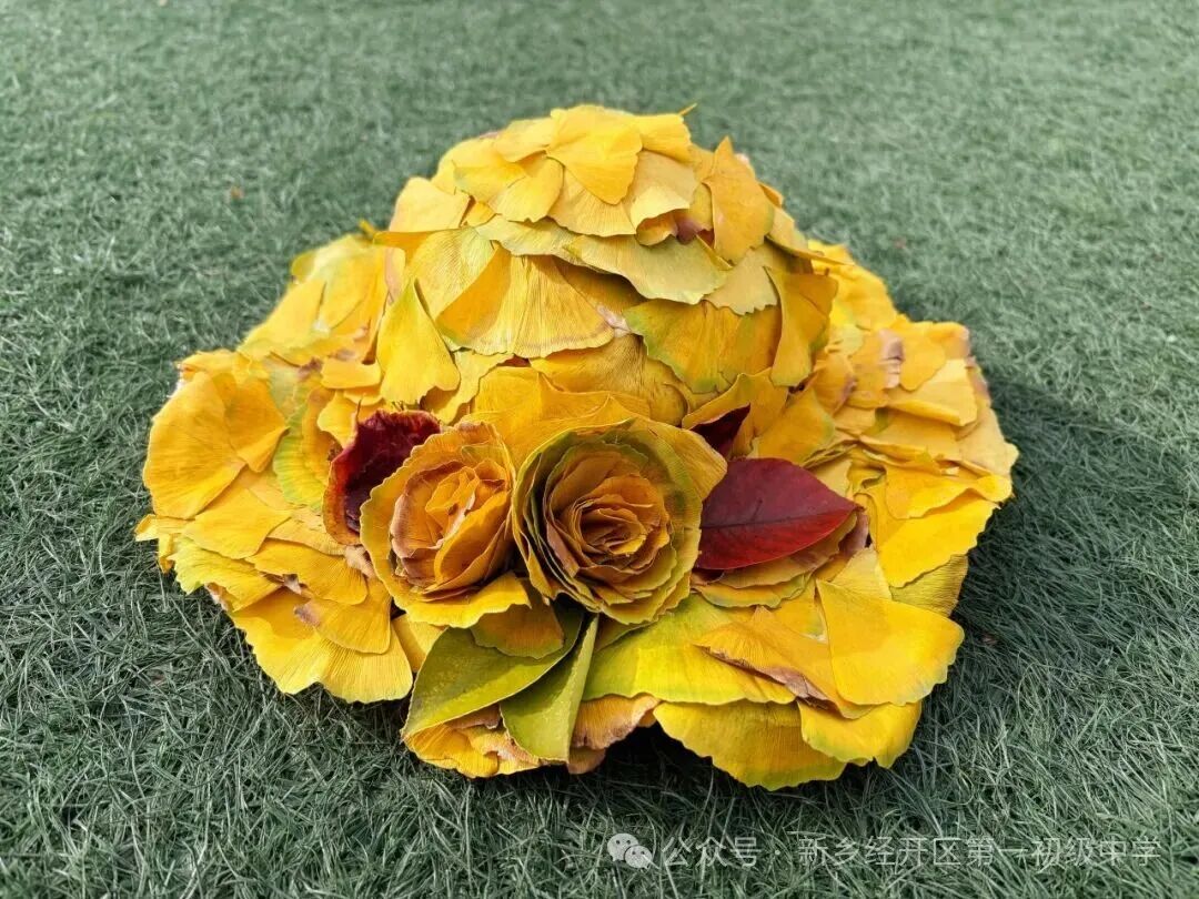 有的同学将叶片组合成花束,搭配其他落叶,创作出富有层次感的艺术作品;有的同学们将一片片金黄的银杏叶卷成玫瑰花瓣,层层叠叠,栩栩如生。
