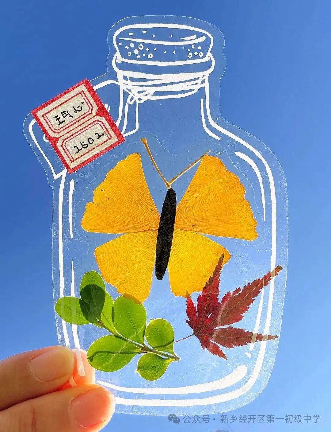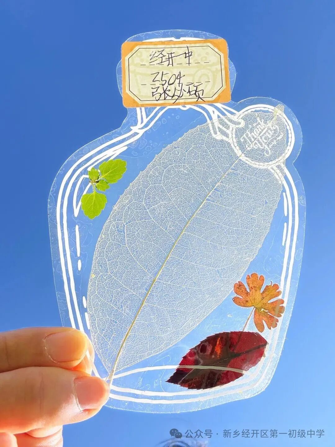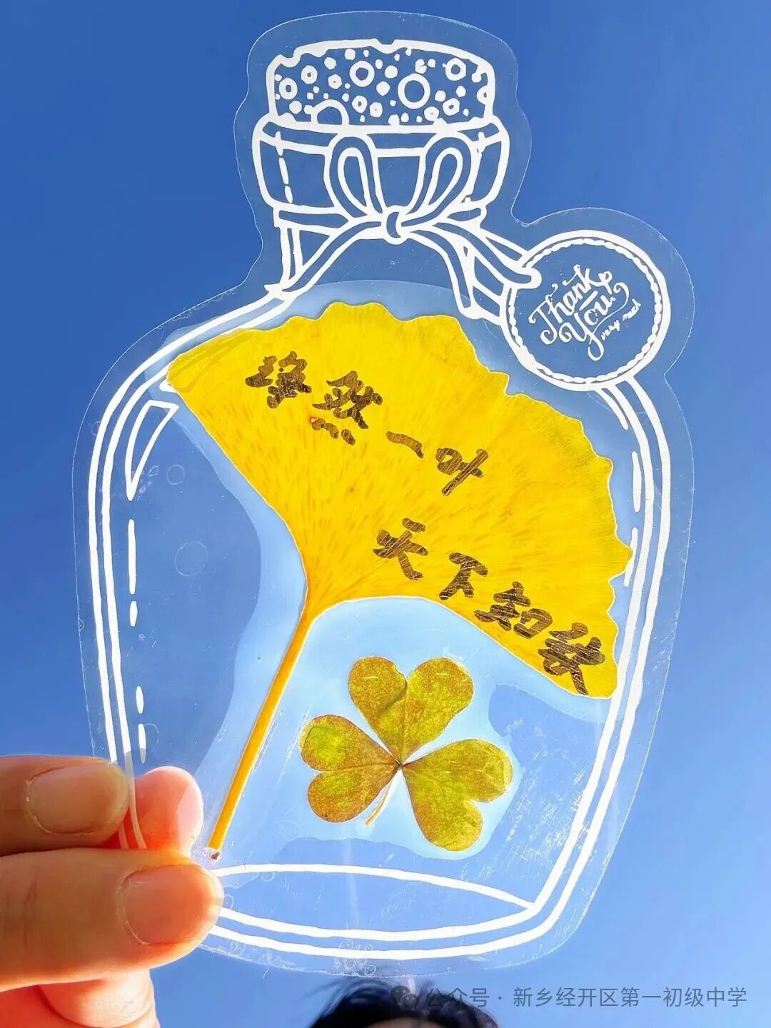 为了将这转瞬即逝的秋日之美长久珍藏,他们将树叶拼成灵动的图案,有的同学还在其中嵌入一句悄悄话,让情感与植物一同被封存于一方透明的书签中。