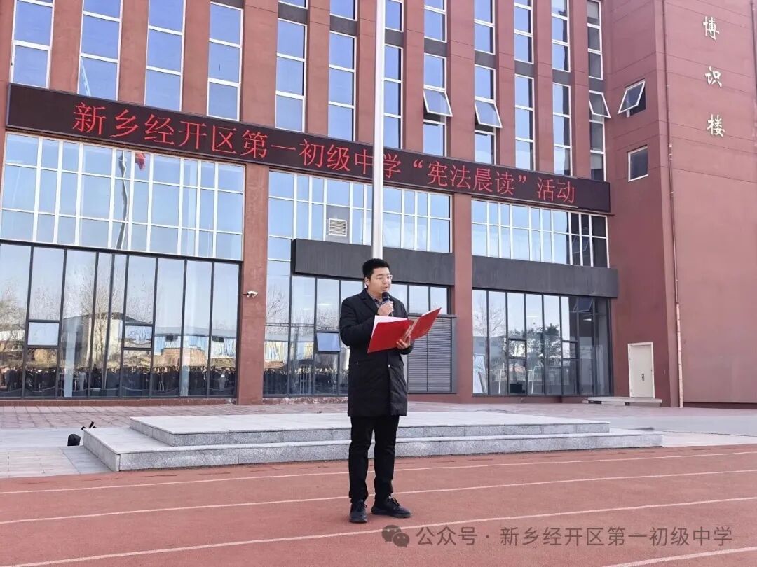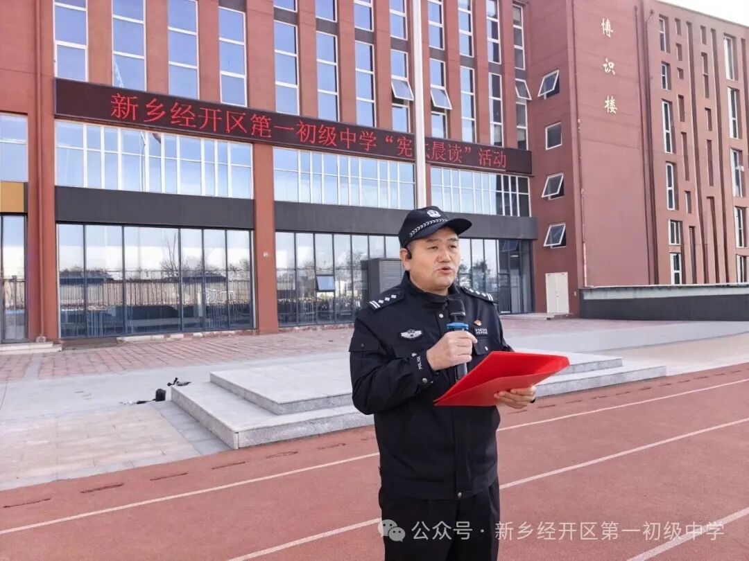 12月4日上午,全校师生齐聚操场,在学生指导中心主任米若萱的领读下,齐声诵读宪法部分条款。副校长李永超聚焦青少年日常,结合校园常见场景,为全体师生解读了新修订的《治安管理处罚法》中与未成年人密切相关的内容。随后,新乡市公安局红旗分局纬七路派出所四级警长赵继红作总结讲话。赵警官肯定了晨读活动意义,并从“知法、懂法、守法、用法” 四个维度对学生提出殷切期望。