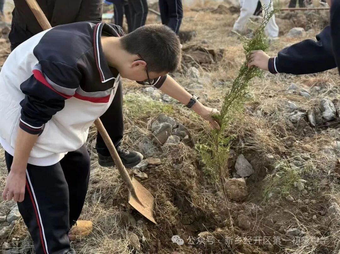 在巍巍太行脚下,同学们挥锹铲土、扶苗填坑,每一个环节都一丝不苟,每一个动作都充满着对生命的期待。看着亲手栽下的一棵棵小树苗在春风中昂然挺立,每个人的脸上都洋溢着自豪与喜悦。