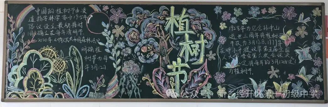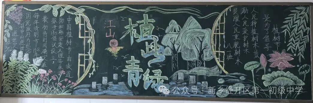 二、方寸黑板,绿意生花 教室,是同学们学习生活的主阵地,也是班级文化建设的重要载体。在植树节来临之际,八年级各班围绕“植树节”主题,精心创作了一幅幅内容丰富、色彩斑斓的黑板报。
